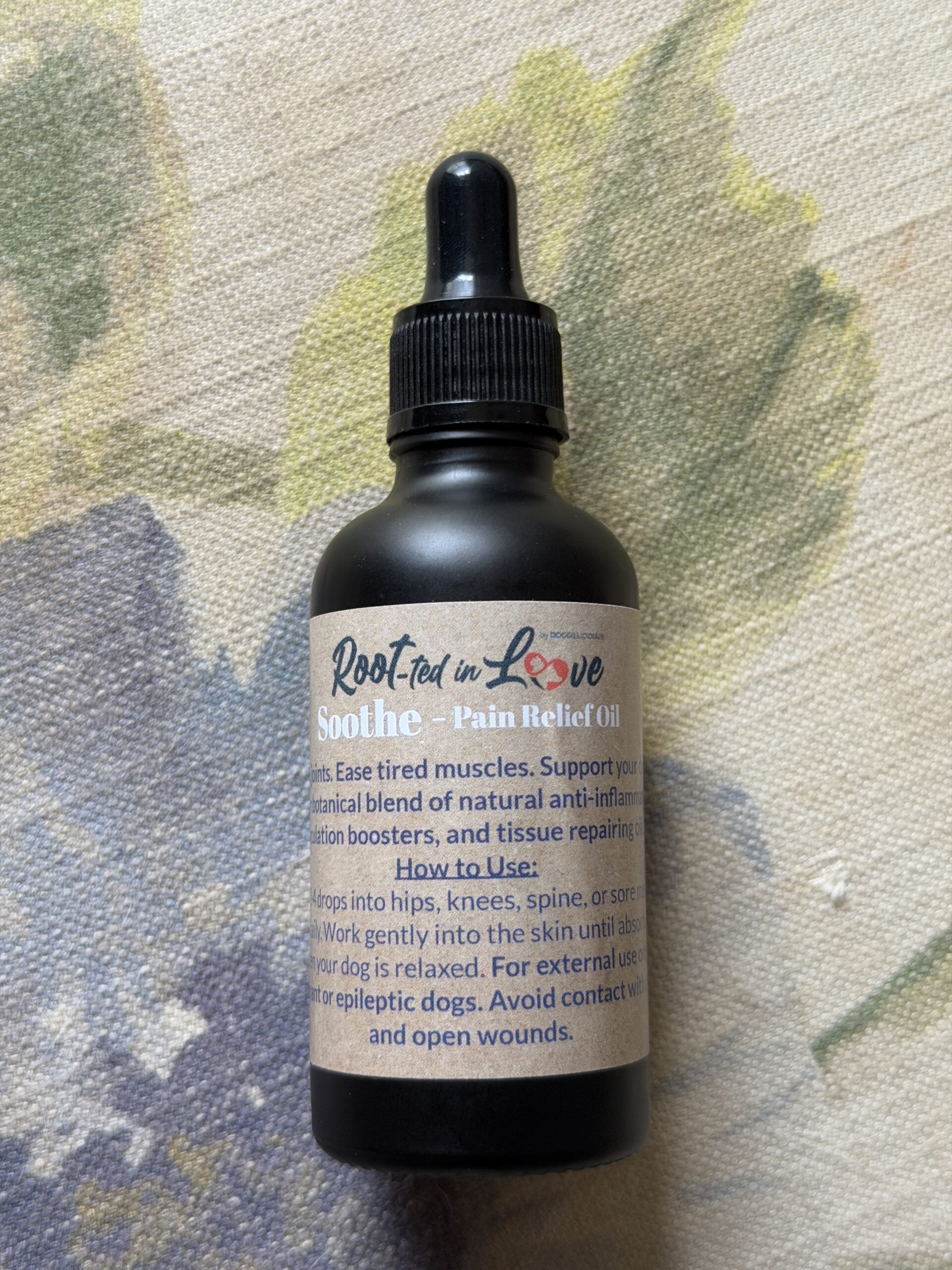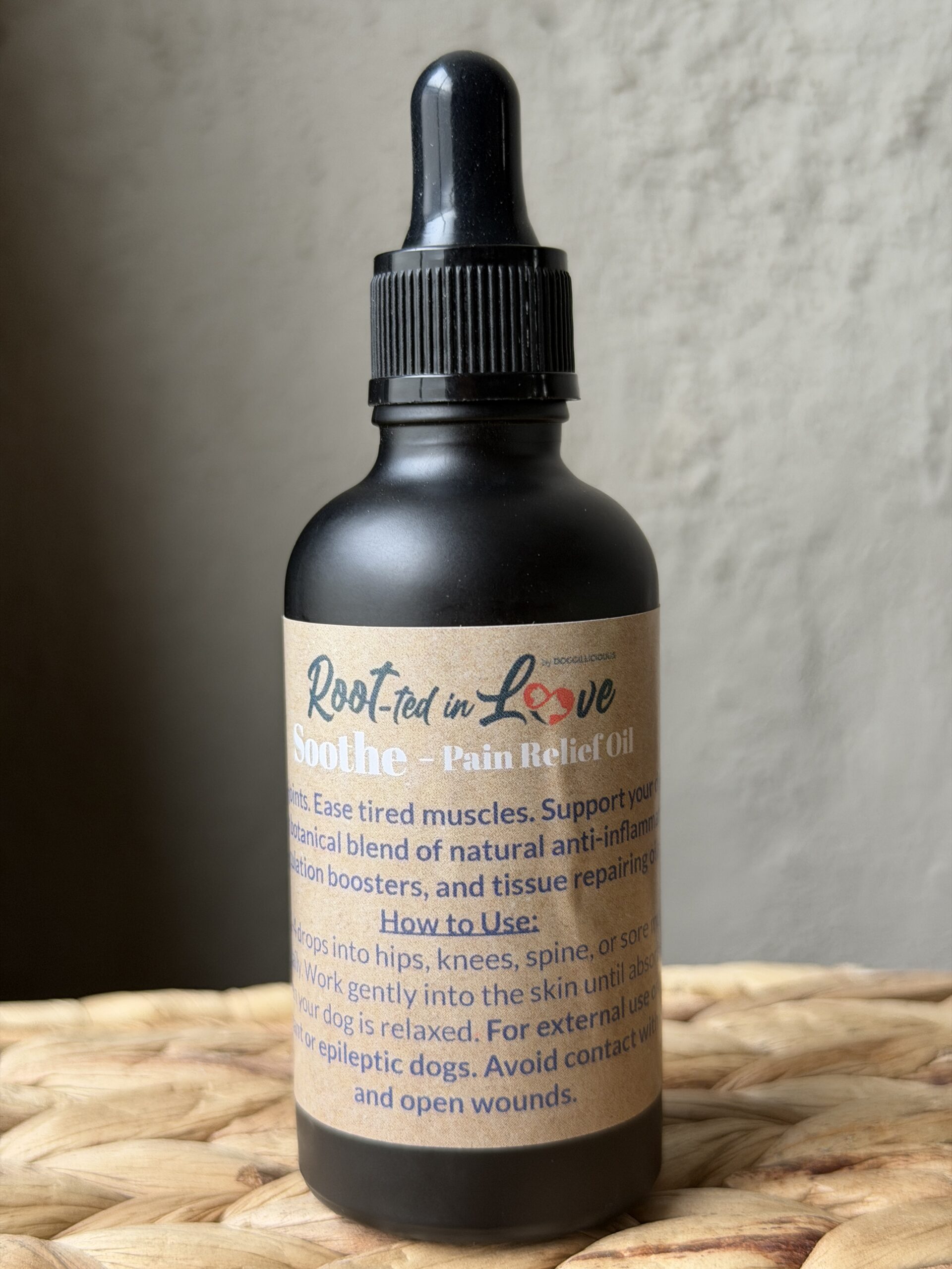 Gentle yet powerful, Soothe is a therapeutic massage oil crafted to ease aches, stiffness, and everyday wear-and-tear. Infused with botanical extracts and natural anti-inflammatories, it helps your dog move freely, recover faster, and rest more comfortably – without any harsh synthetics. We ALWAYS use only pure therapeutic grade essential oils in our products.